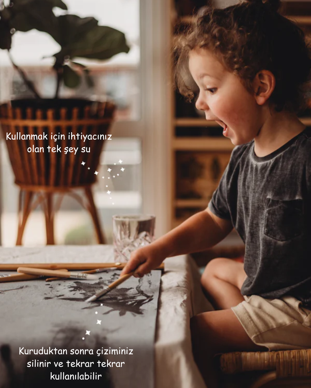 Suyla boyama deneyimi; dikkatini toplamasına, hayal gücünü geliştirmesine ve sakinleşmesine yardımcı olur. Üstelik hiçbir leke bırakmadan, tekrar tekrar kullanılabilir!